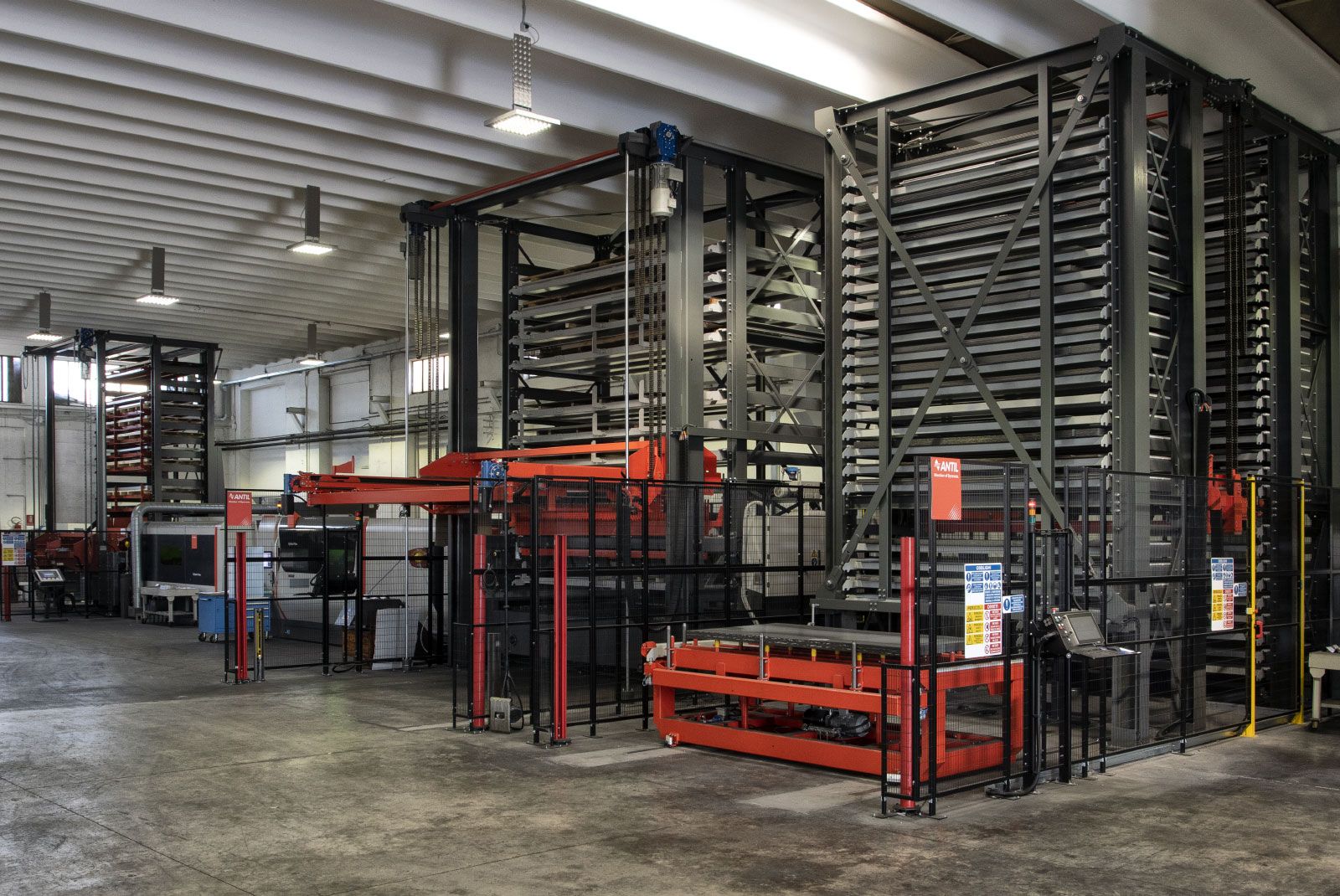 Entrambi gli impianti sono serviti da un magazzino di stoccaggio lamiere automatico Antil, con 50 cassetti della portata di  2500Kg cadauno e relativa torre di carico sempre automatizzata.